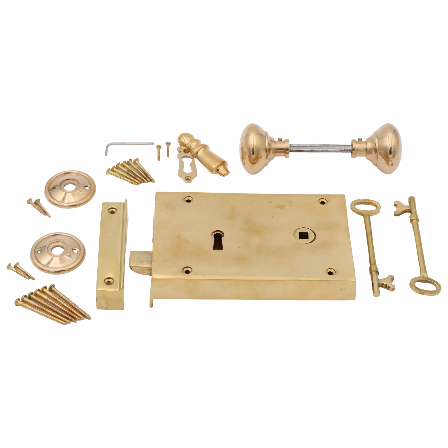 Complete set as shown: Rim Lock, Key, Spindle, Two Knobs, a Rosette, and Escutcheon.