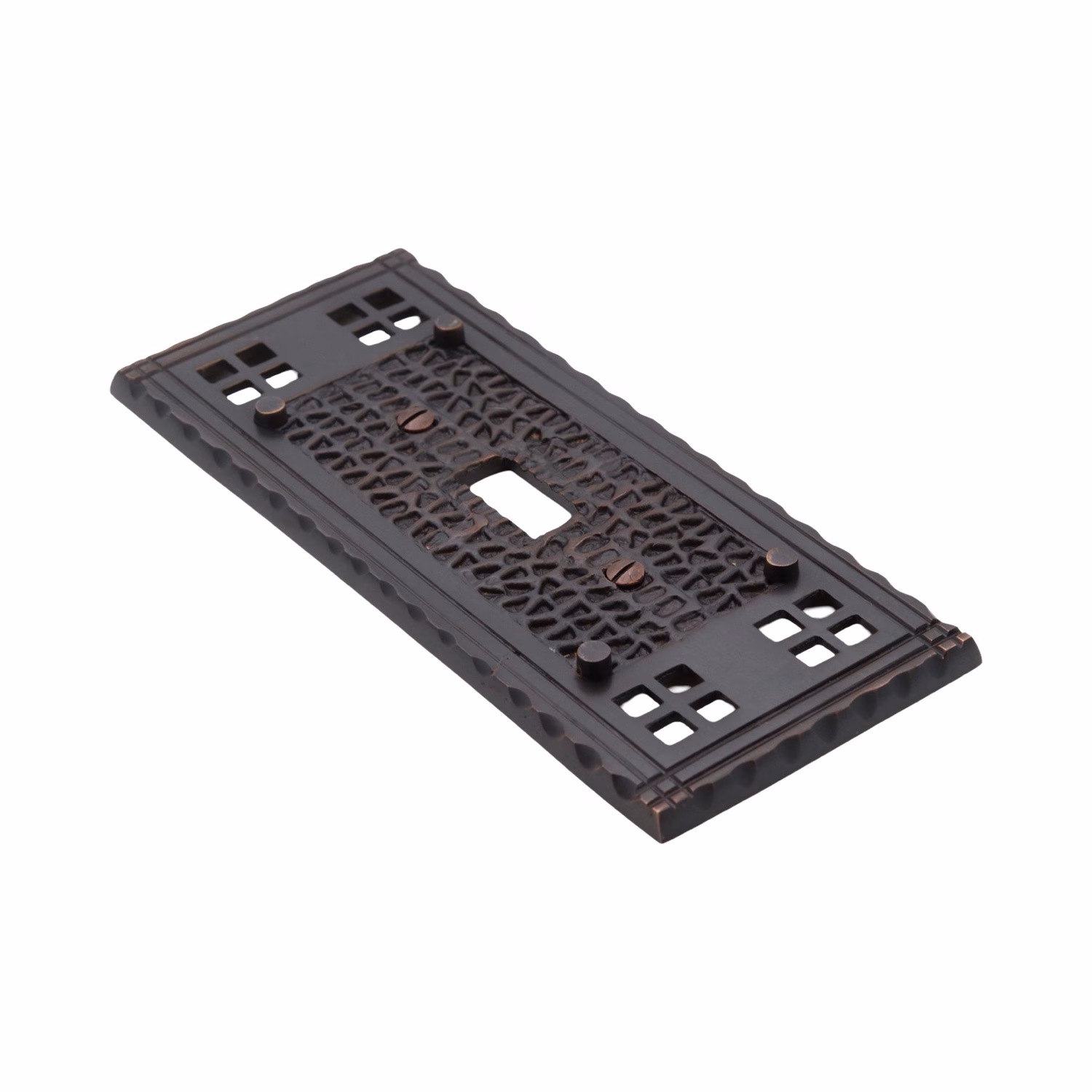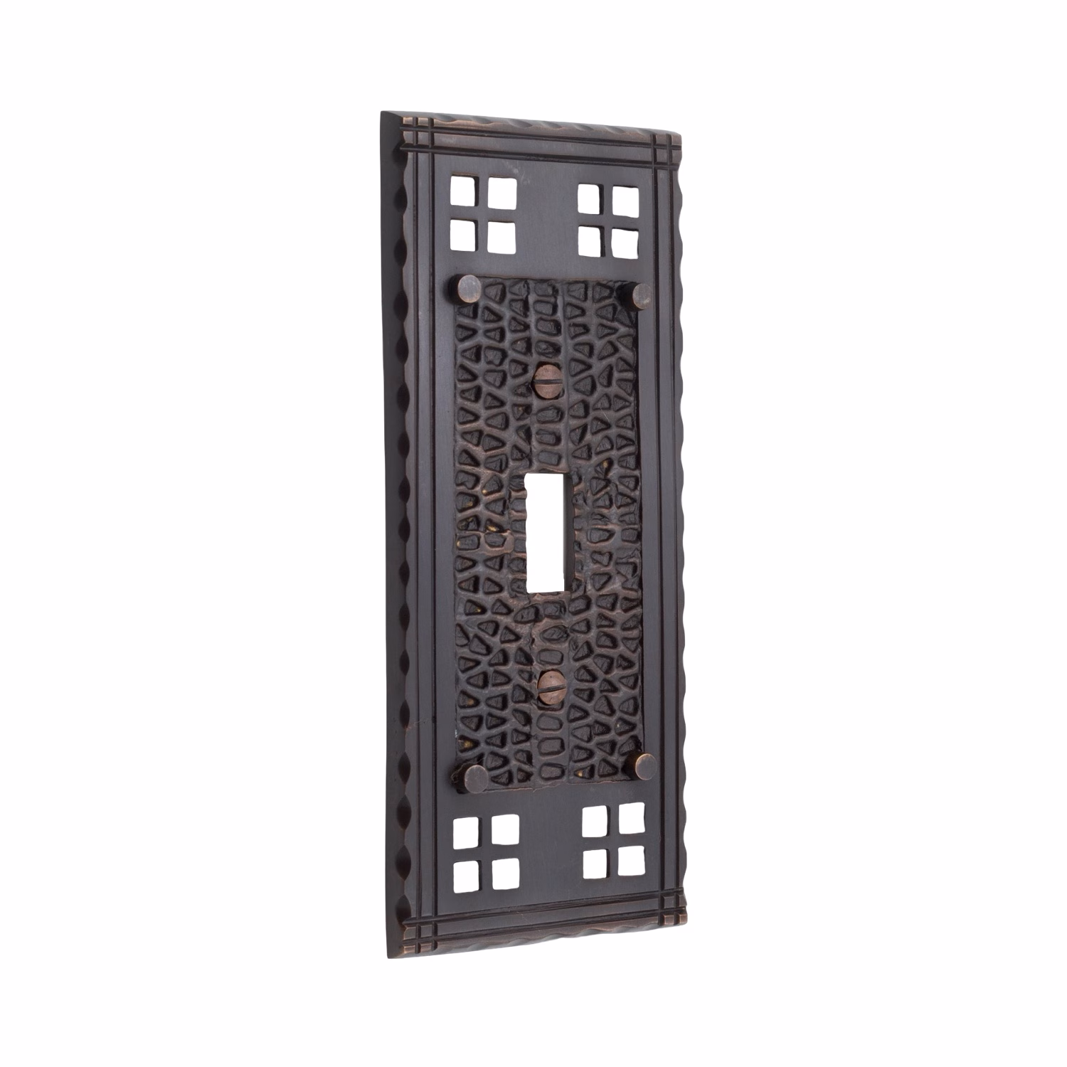 This Arts and Crafts or Bungalow Style solid brass switch plate cover features an oil rubbed finish with hammered-texture surface.
