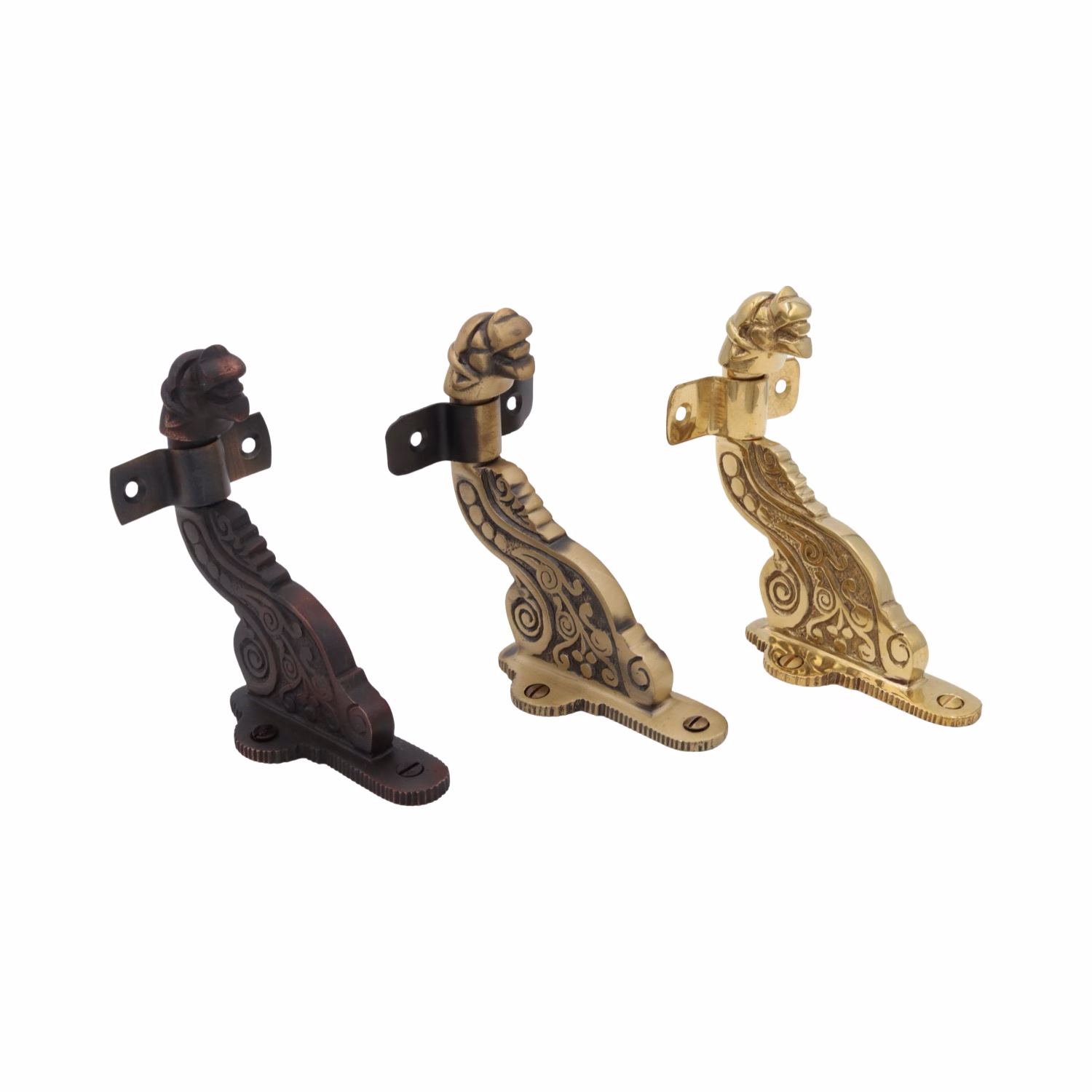 sits these Victorian style, solid cast brass Gargoyle hand rail brackets.