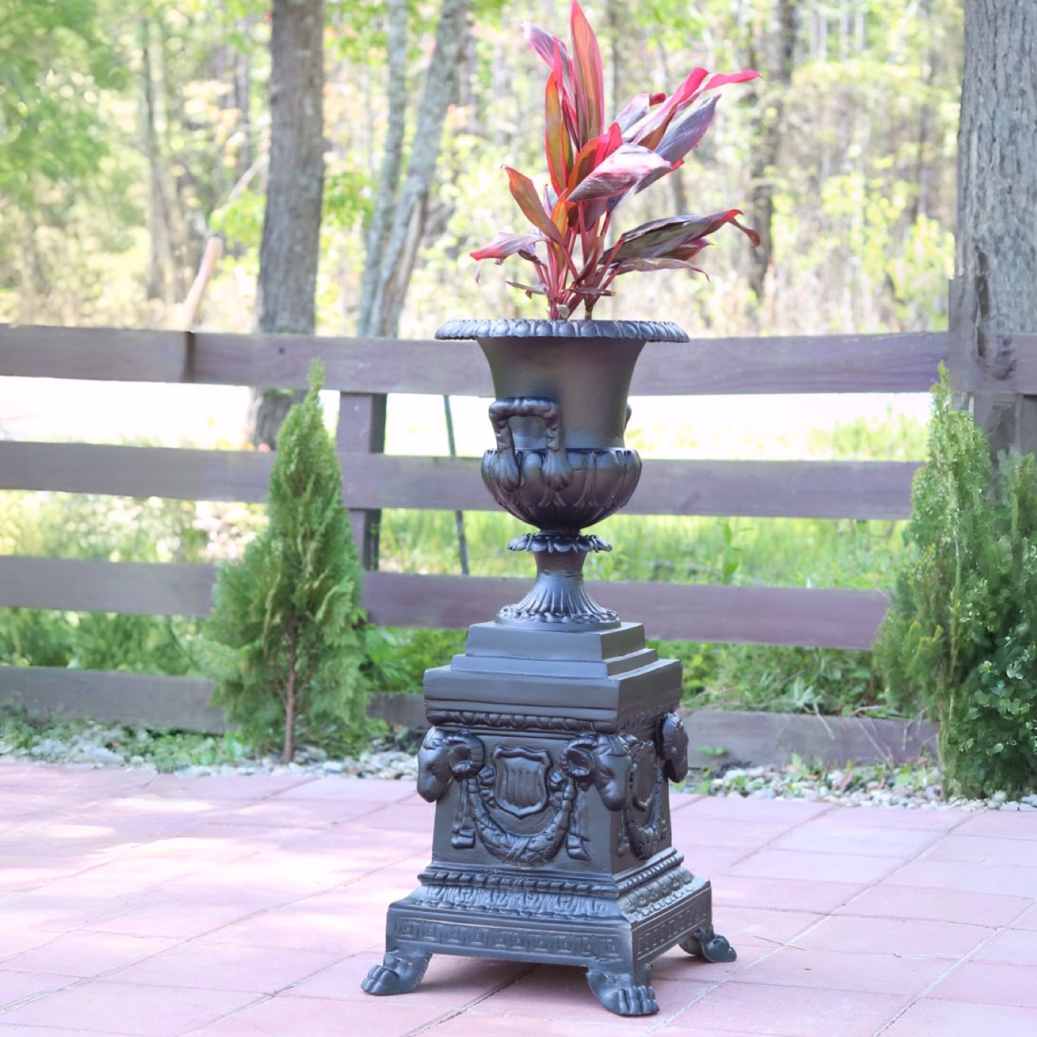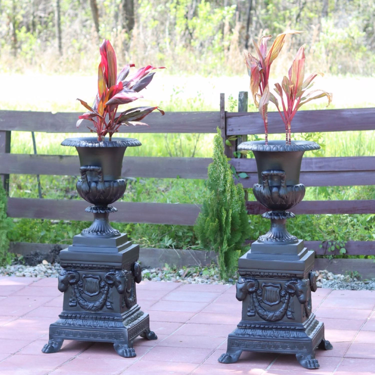 Enhance your garden decor with this elegant pair of handmade Presidential Garden Urns featuring a classic Victorian style on our Rams Head Base. Crafted from heavy, durable, non-rust aluminum, each urn is adorned with a detailed ram head base, adding a touch of sophistication and historical charm to any outdoor space. Perfect for creating a regal and timeless ambiance for your garden, porch, or patio.