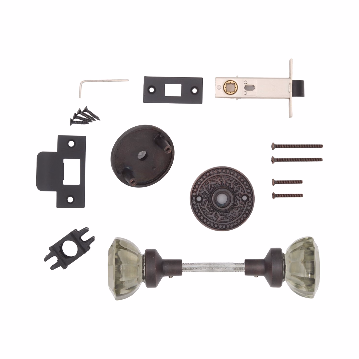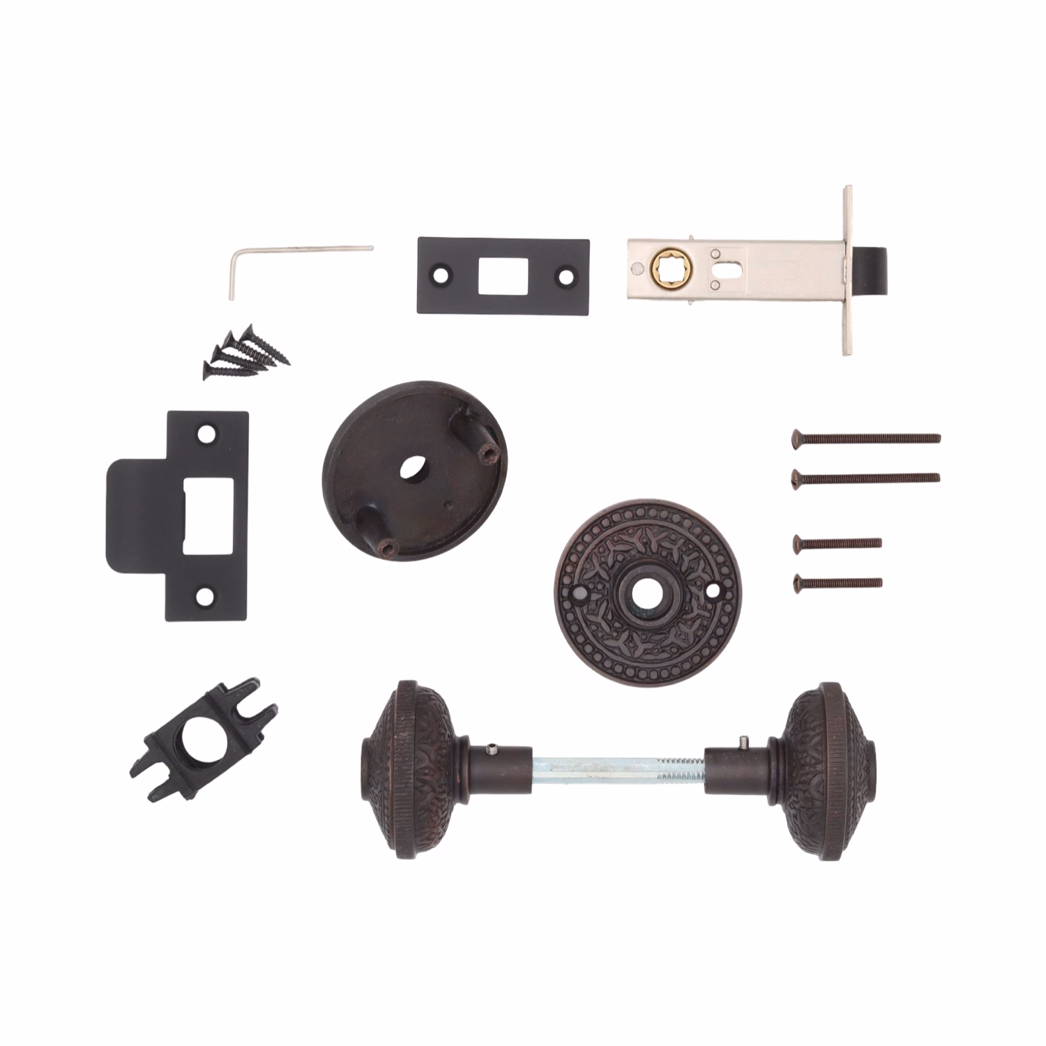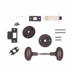 Passage sets come with: 2 knobs, 2 rosettes, spindle, and passage door latch.